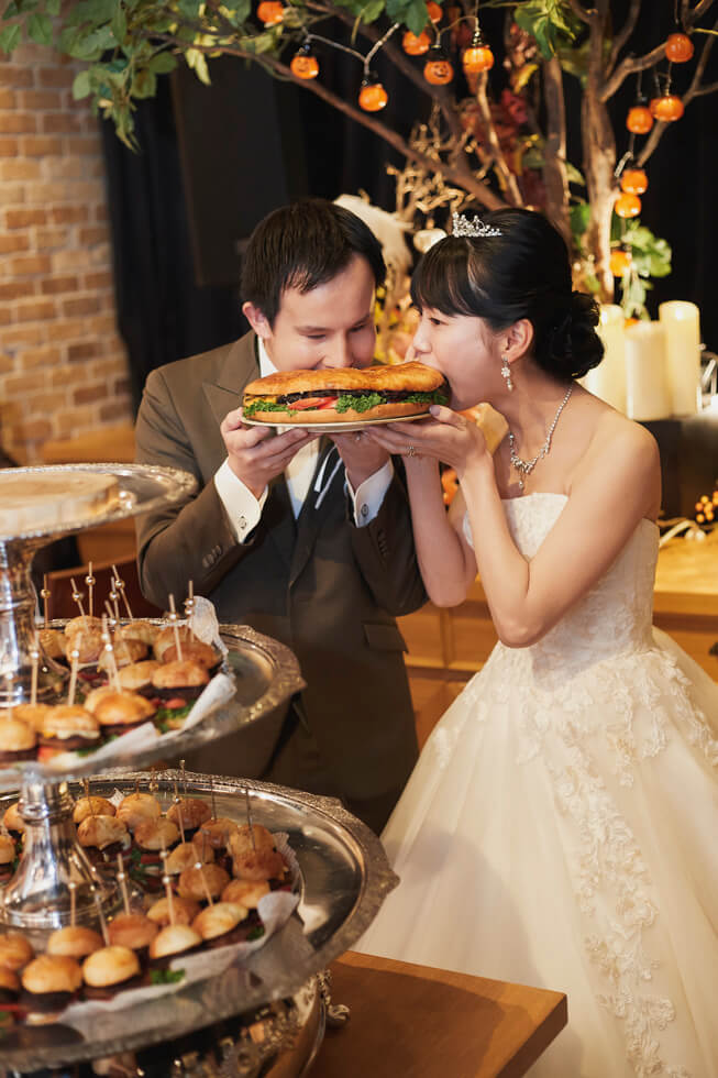 パーティー内の演出は、形式にとらわれない、心からの“おもてなし”としてハンバーガーを選ばれたおふたり。