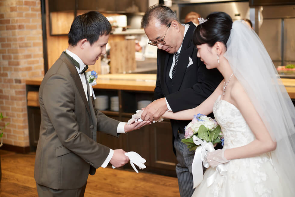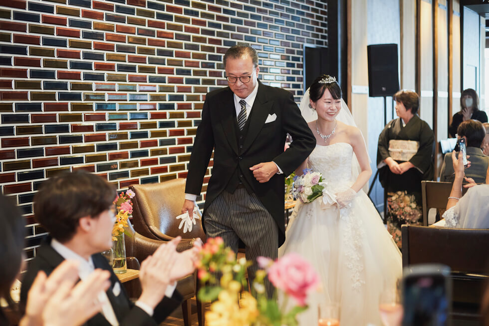 パーティーのご入場はご新郎様はお母様から「ジャケットセレモニー」を、ご新婦様はお父様と一緒に入場をされ、ご新郎様へのバトンタッチとなるセレモニーを行うことで親御様への感謝を伝えられました。