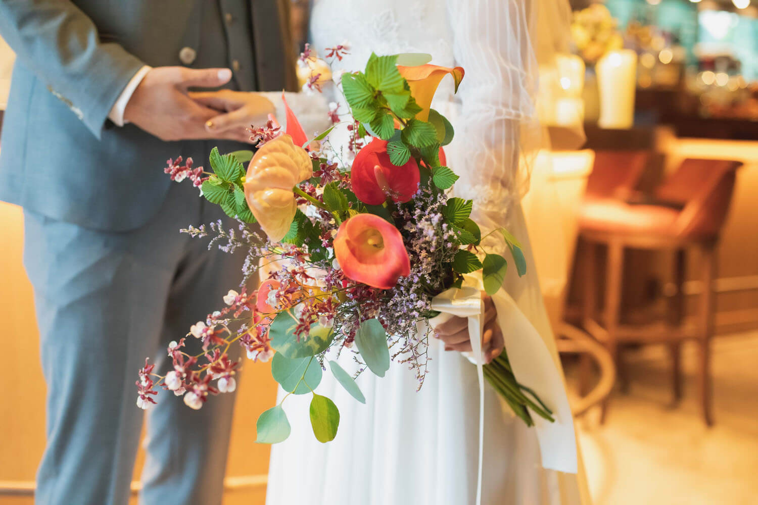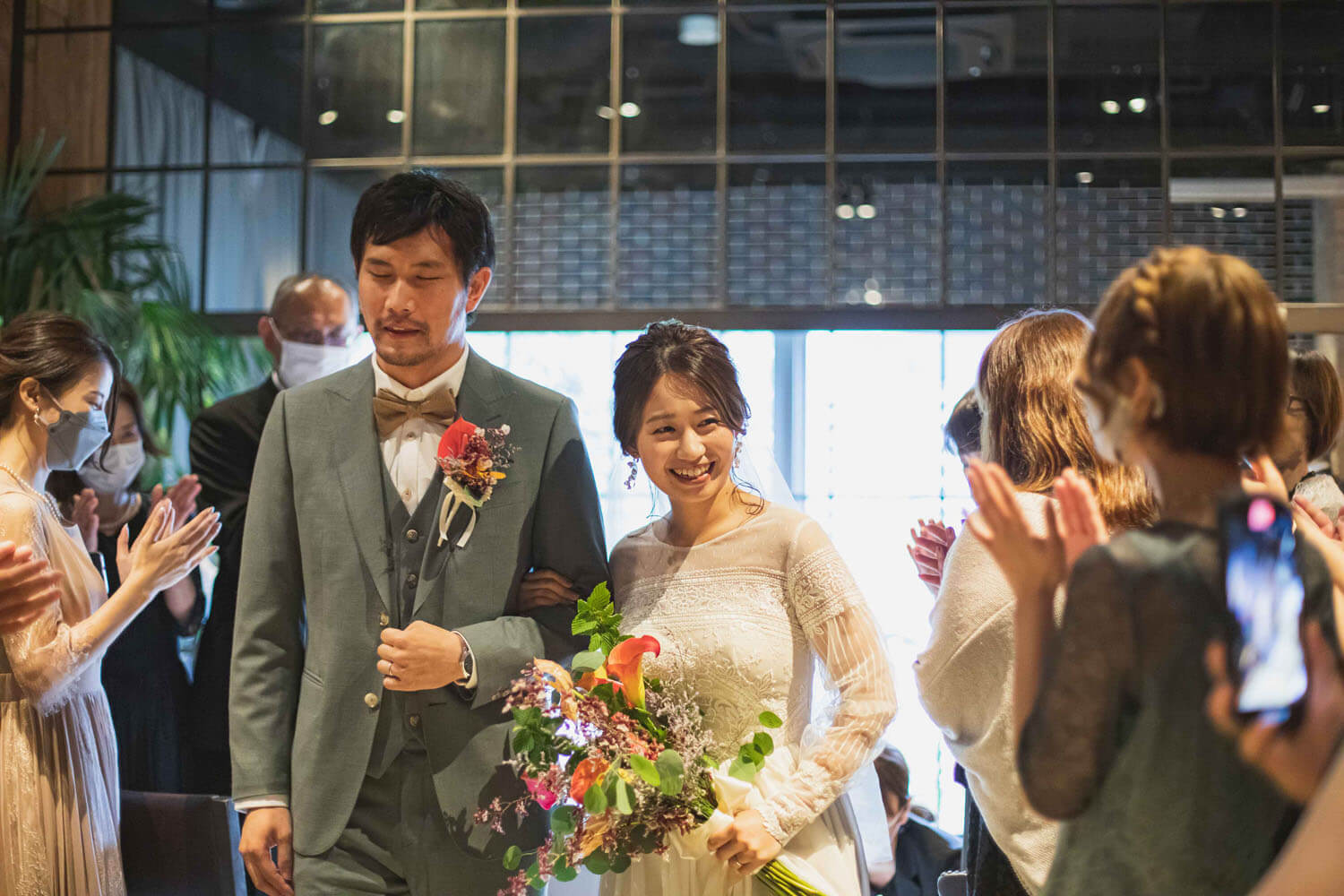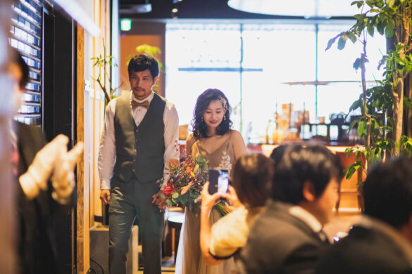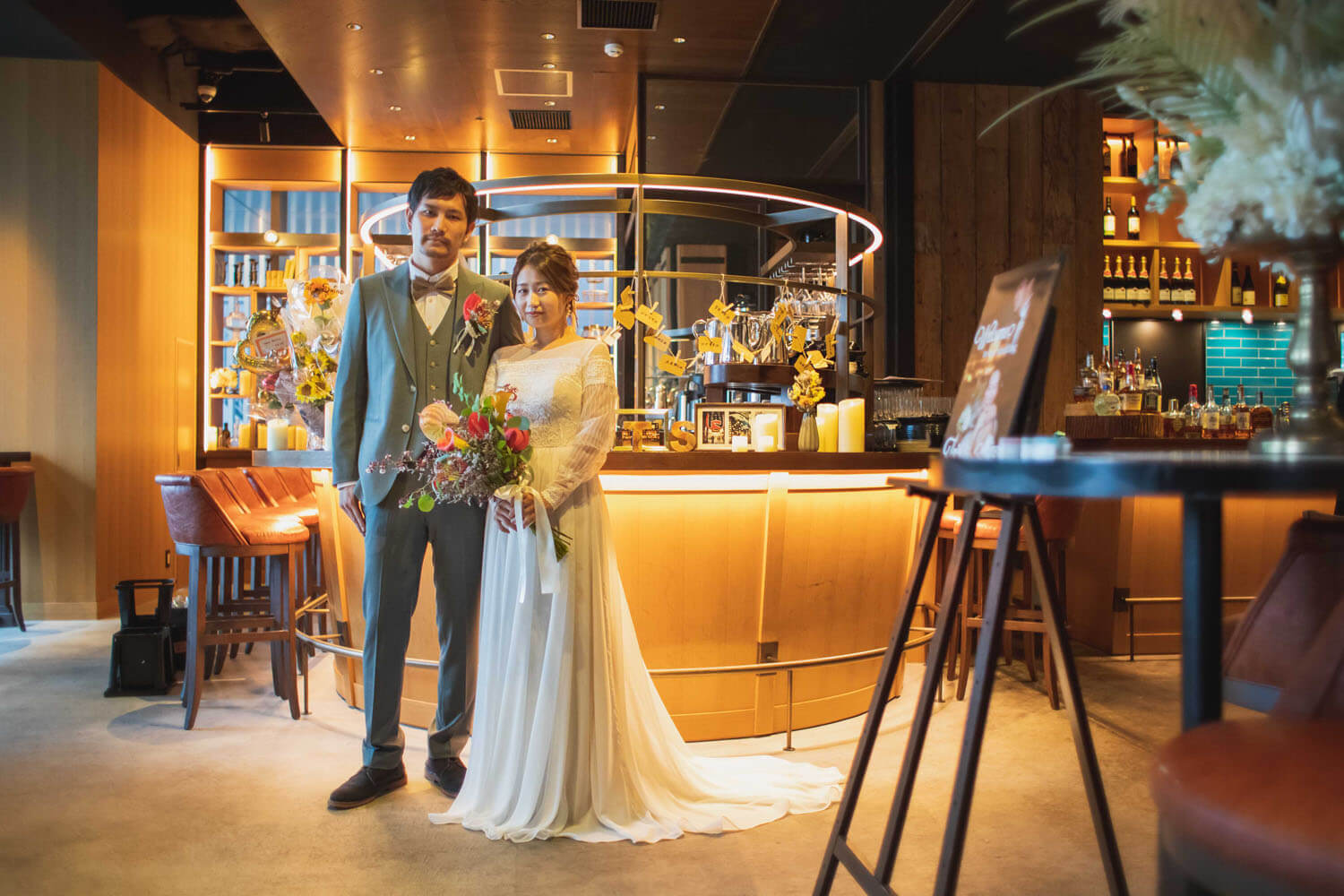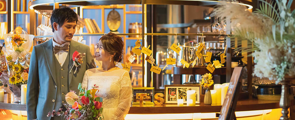 会場は温かみのあるお花にパンパスグラスを合わせトレンドを取り入れた素敵な空間に。ゲストと近くで楽しむためにあえてソファーをメインとして取り入れることで、アットホームでゲストの皆様が自然とお二人の元に集まるようなおふたりの想いをカタチにしました。
