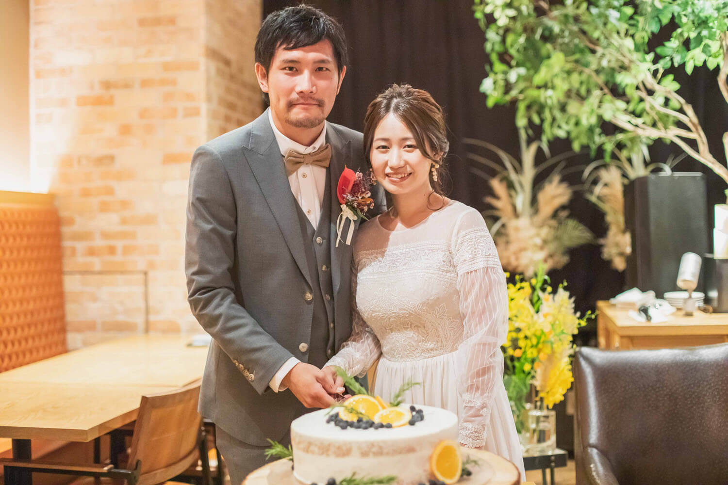ウェディングケーキは、会場の雰囲気に合わたネイキッドケーキをご提案。 会場装花の温かい色味と雰囲気を合わせるために用意したのがドライオレンジとブルーベリーです。黄色やオレンジなどの暖かさとブルーベリーのアクセントがとてもかわいく、丸太の上にのせることでこだわりのケーキさらに一段とお二人らしさが伝わるデザインとなりました♪