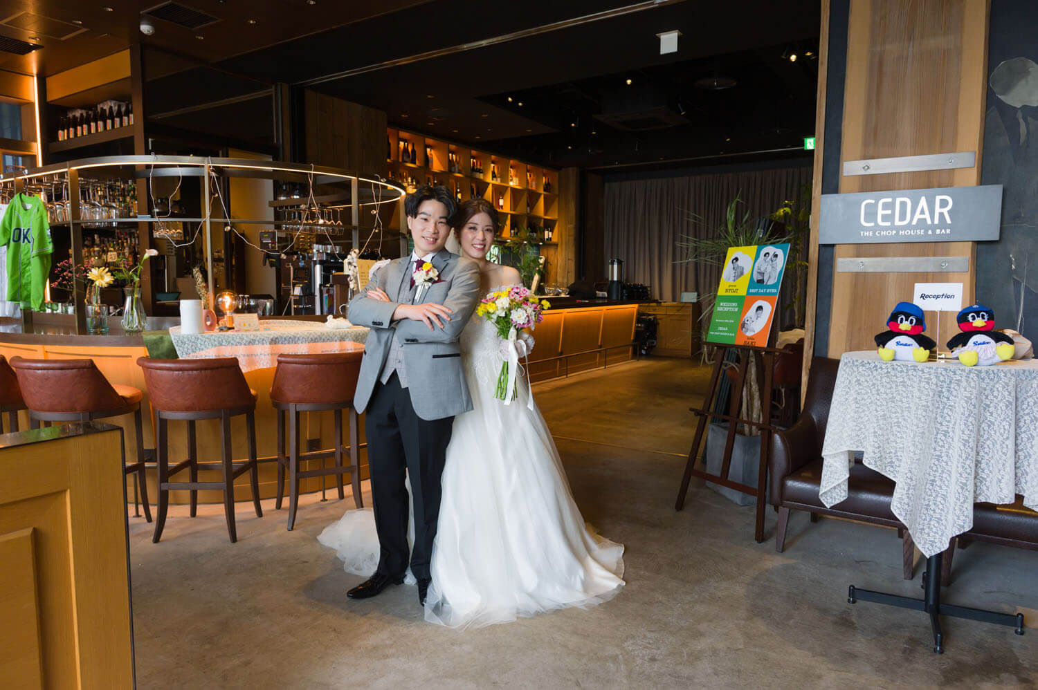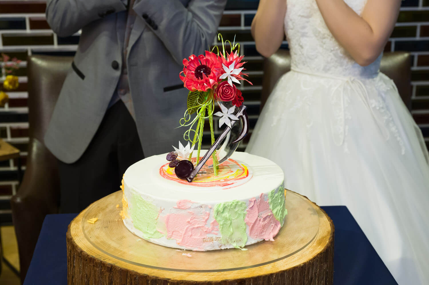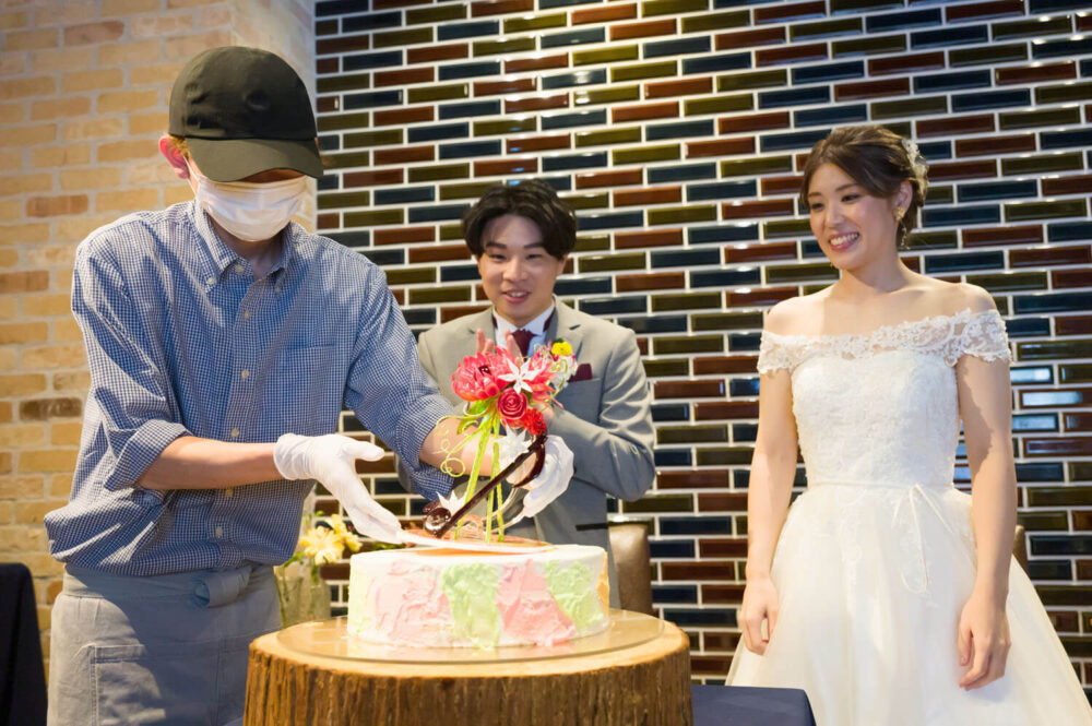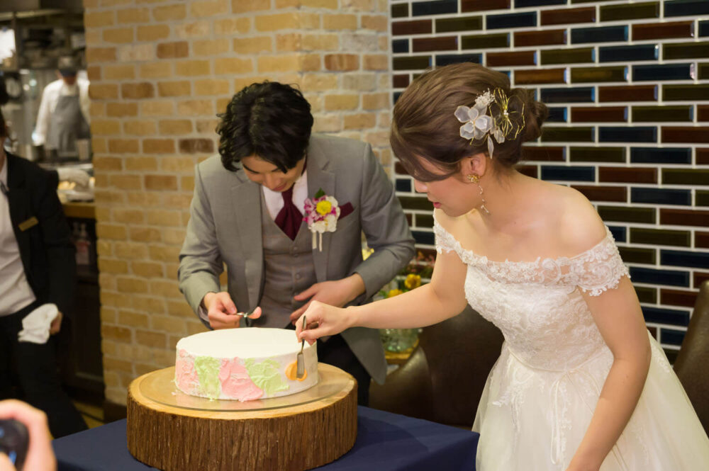 挙式の結びには祝福の拍手をたくさんいただきゲスト全員がご友人になったような温かい人前式になりました。ゲストを大切にされているお二人だからこそ、ウェディングケーキをゲストの方々で飾り付けをしました! また、当店のパティシエの手作りの飴細工をケーキの上に乗せ華やかなケーキを完成させました。CEDAR THE CHOP HOUSE&BARにしかできないケーキの演出にたくさんの歓声を受けました。