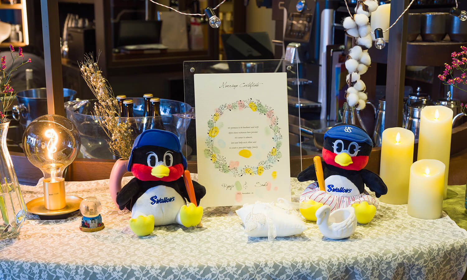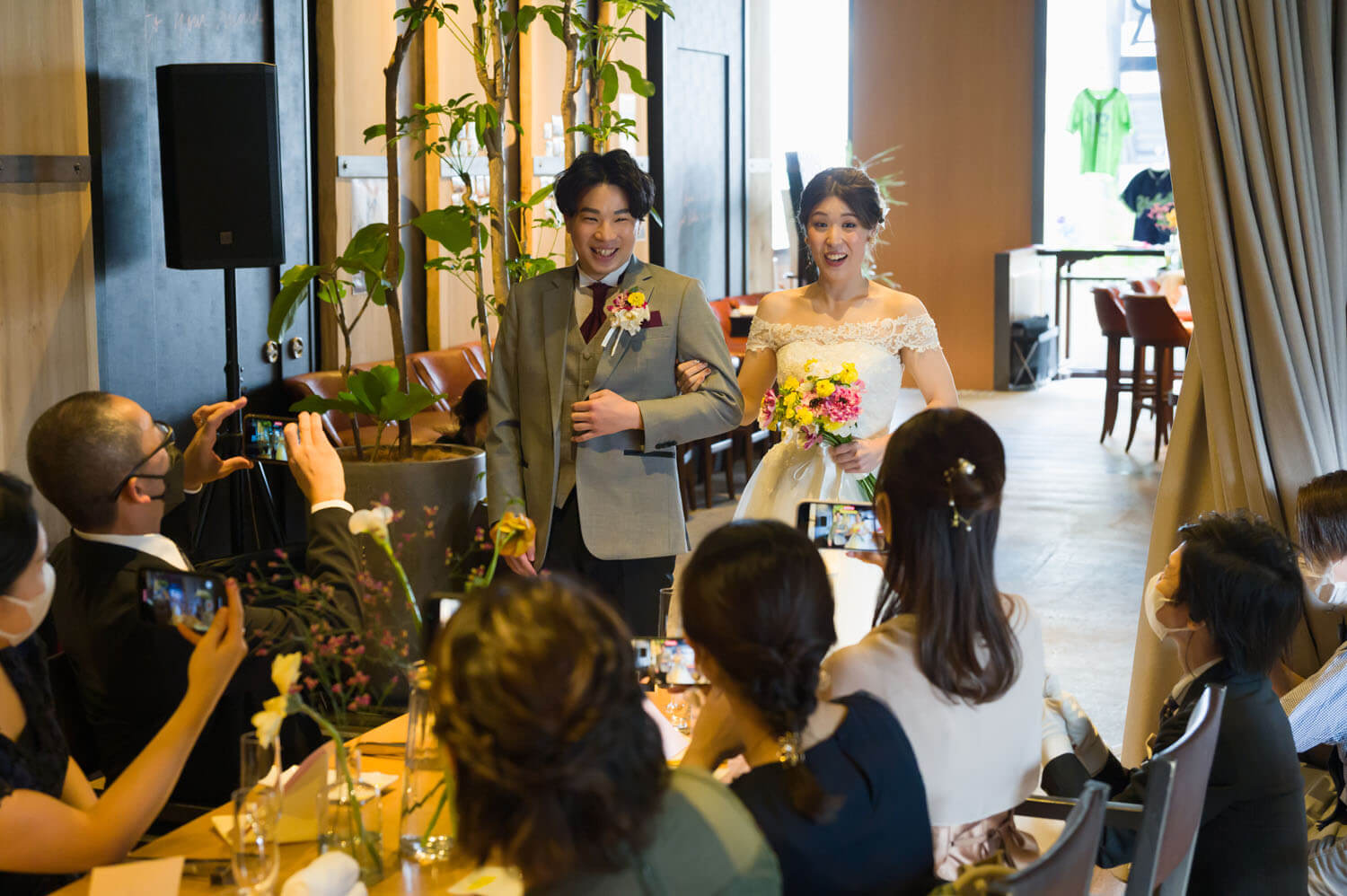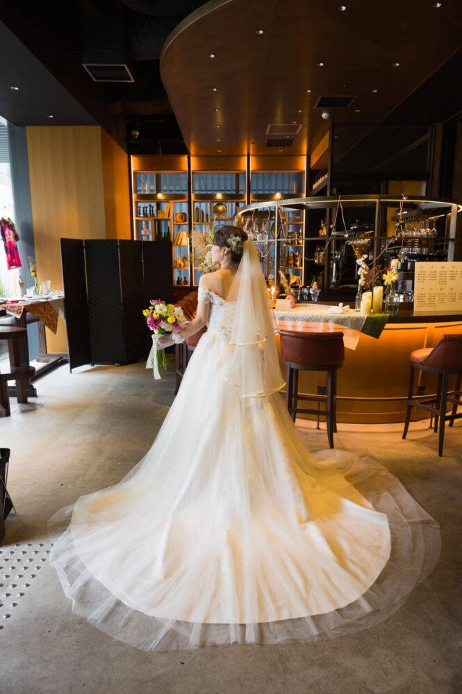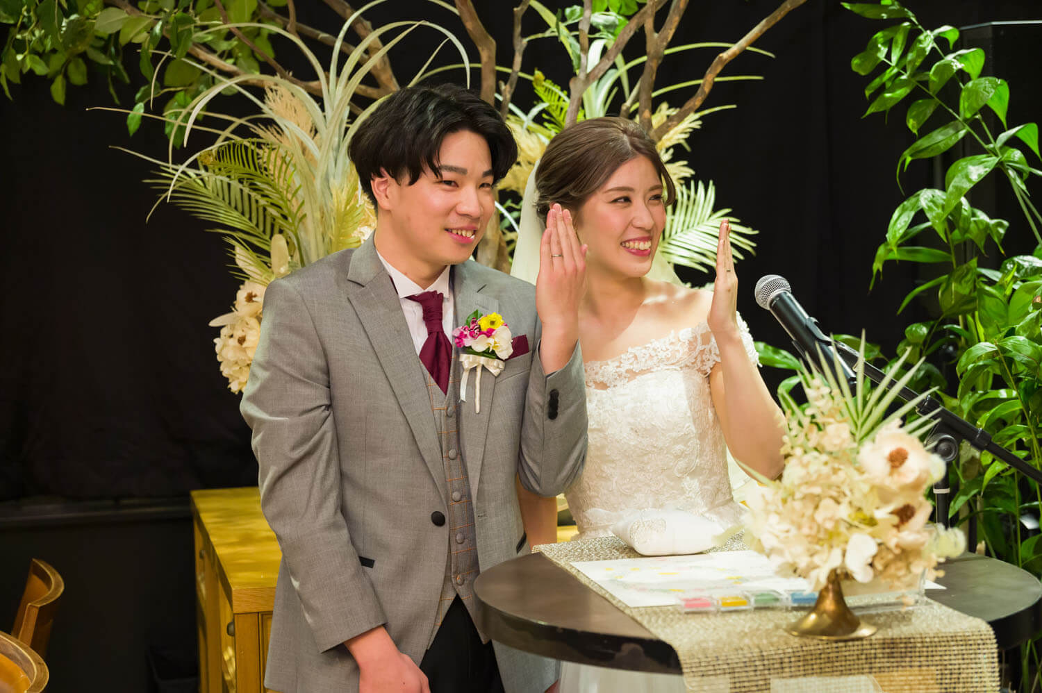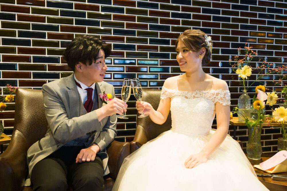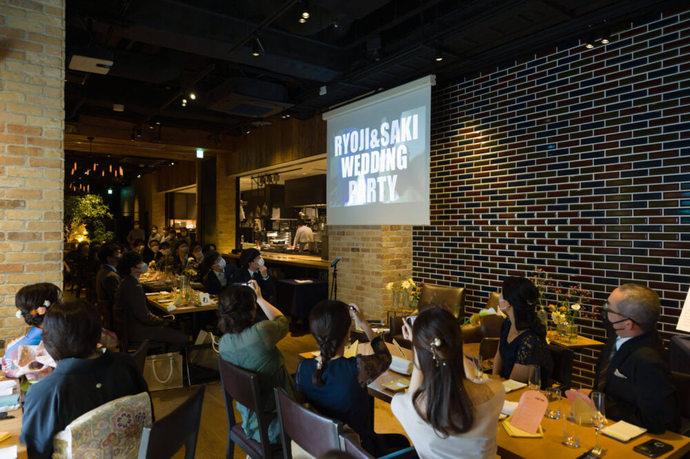 お二人は今まで出会ってきたご友人、ご家族をとても大切にされています。この結婚式を通してお互いの大切なゲストを知ってもらえるように披露宴内人前式を選びました。お料理などを楽しみながらお互いの大切なゲストを巻き込んでのオリジナル人前式は披露宴の途中で行われました。